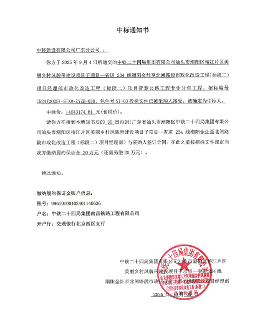 中鐵二十四局集團(tuán)有限公司汕頭市潮陽區(qū)榕江片區(qū)美麗鄉(xiāng)村風(fēng)貌帶建設(shè)項(xiàng)目子項(xiàng)目——省道234線潮陽金灶至北閘路段市政化改造工程(標(biāo)段二)項(xiàng)目經(jīng)理部市政化改造工程(標(biāo)段二)項(xiàng)目智慧公路工程專業(yè)分包工程中標(biāo)公告